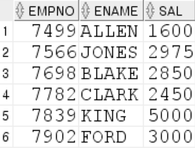 SELECT empno, ename, sal FROM emp WHERE sal>1500;