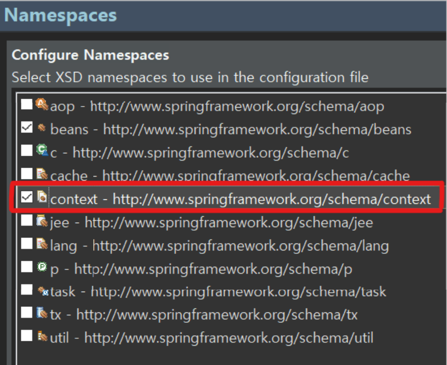 XML 방식을 사용하기 위해서는 XML 파일의 namespace context를 체크한 후, 다음의 코드를 추가해 줍니다.