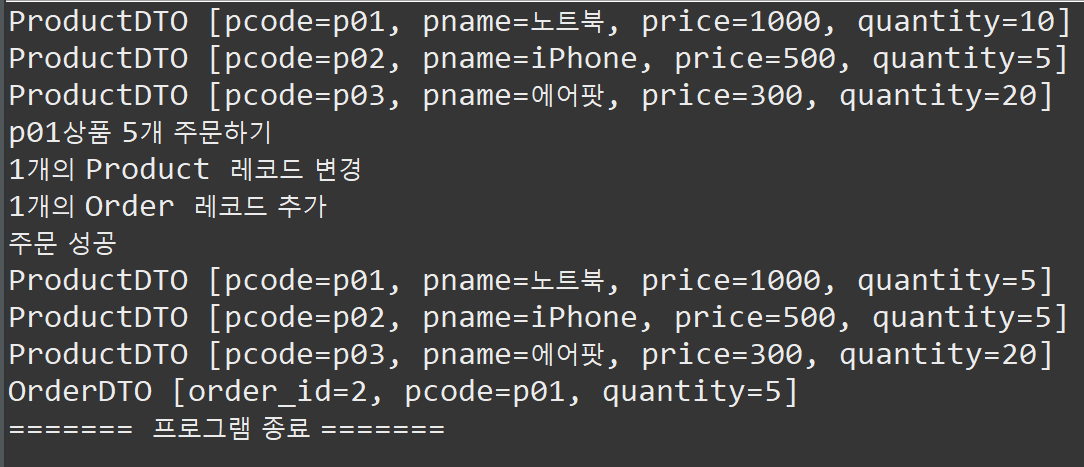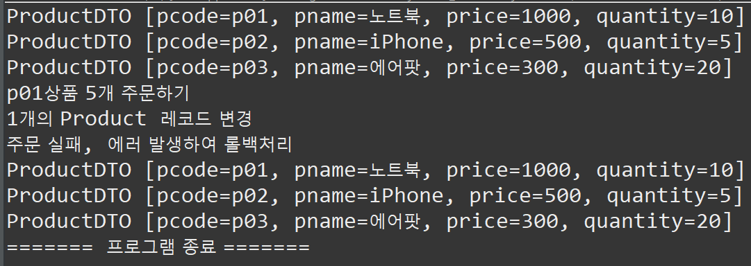 주문하는 과정에서 상품 수량 감소는 정상적으로 이루어져 'Product 레코드가 변경되었다'는 메시지가 출력되지만, 이후 주문을 추가할 때 예외가 발생하여 'Order 레코드가 추가되었다'는 메시지 출력 없이 Main의 catch문의 '주문 실패' 메시지가 출력된 것을 확인할 수 있습니다. 다시 전체 상품 목록을 조회했을 때 "p01" 상품의 수량이 변경되지 않은 것을 보면 트랜잭션 처리가 올바르게 된 것을 확인 수 있습니다.