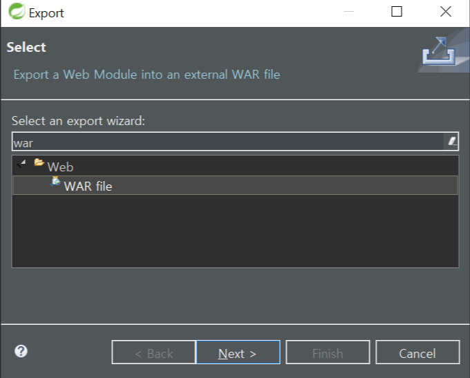 프로젝트 우클릭 - Export - WAR file - Next - 파일을 저장할 로컬 경로 지정 - Finish