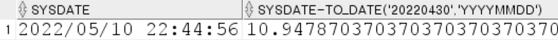 SELECT SYSDATE, SYSDATE-TO_DATE('20220430','YYYYMMDD') FROM dual;