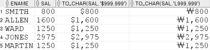 SELECT ename, sal, TO_CHAR(sal,'$999,999'), TO_CHAR(sal,'L999,999') FROM emp;