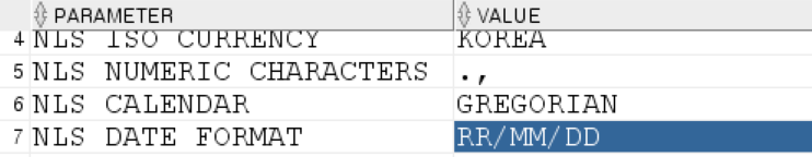 17/08/02 형식으로 출력되는 이유는 오라클이 사용하는 RR/DD/MM 형식 때문입니다. 다음의 SQL문으로 현재 파라미터 설정값을 확인할 수 있습니다.