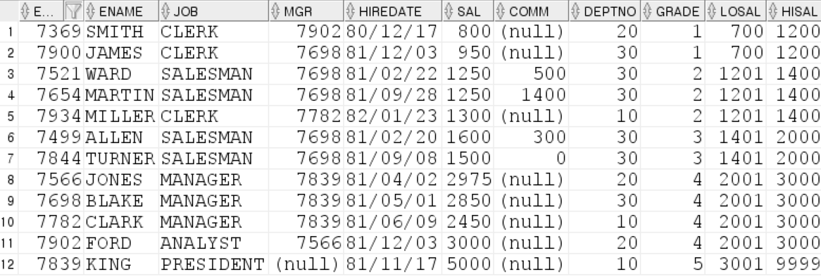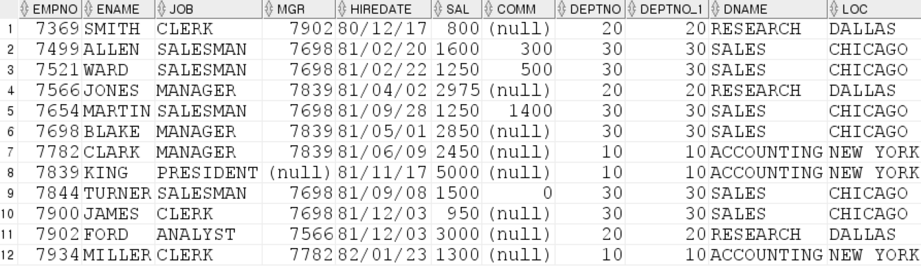 deptno 컬럼이 서로 일치하는 행으로 연결되어, 총 레코드 12개와 컬럼 11개로 조인이 잘 이루어진 것을 확인할 수 있습니다.