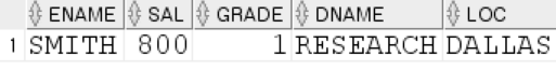 테이블 3개를 조인하여 이름이 SMITH인 사원의 이름, 월급, 월급의 등급, 부서명, 부서지역을 한번에 출력해 보겠습니다.