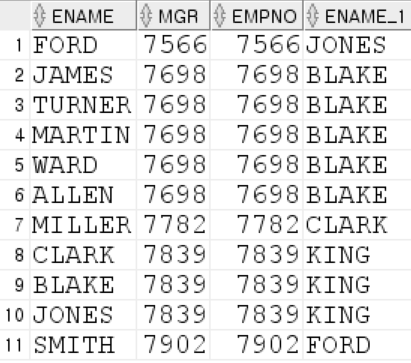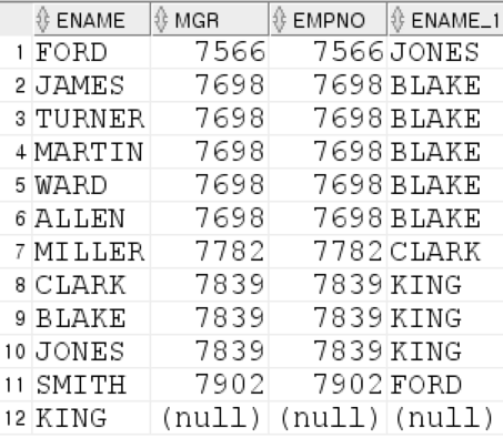 SELECT e.ename, e.mgr, m.empno, m.ename