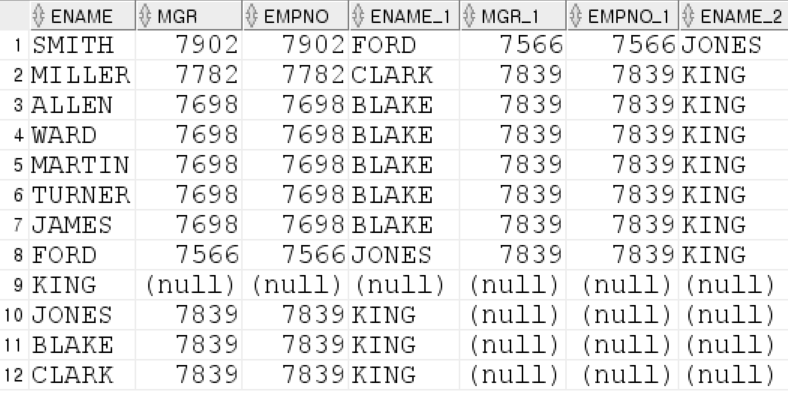 SELECT e.ename, e.mgr, m.empno, m.ename, m.mgr, mm.empno, mm.ename