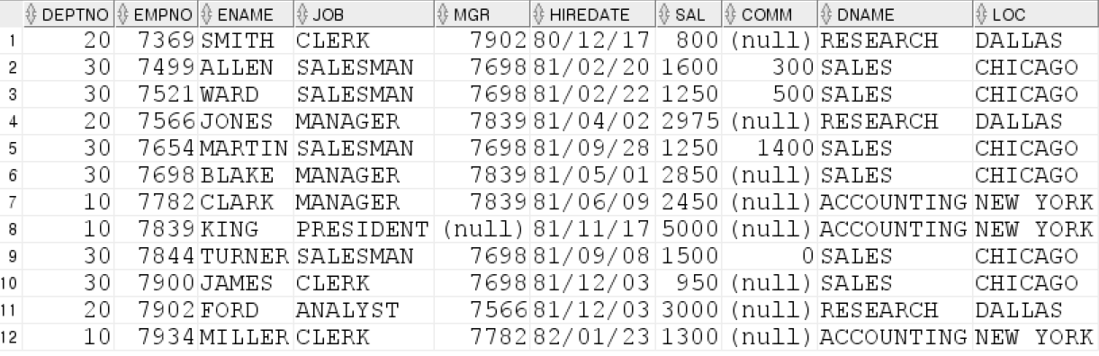 FROM emp e JOIN dept d ON e.deptno=d.deptno