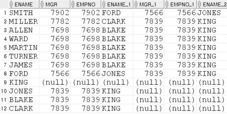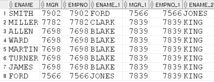 SELECT e.ename, e.mgr, m.empno, m.ename, m.mgr, mm.empno, mm.ename