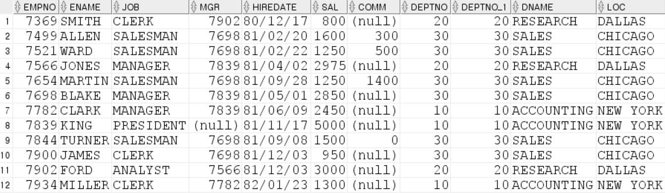 SELECT * FROM emp e JOIN dept d ON e.deptno=d.deptno;