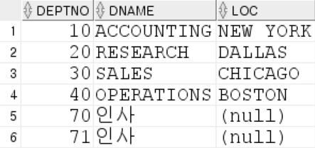 INSERT INTO dept (deptno,dname,loc) VALUES (70,'인사',NULL);