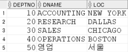 INSERT INTO dept VALUES (50,'영업','서울');