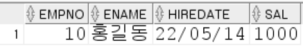 입사일 값을 지정하지 않아도 null로 입력되지 않고, 기본값인 현재 날짜로 입력된 것을 확인할 수 있습니다.