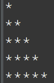 j가 i까지 증가하기 때문에 i가 1일 때 문장이 한 번 수행되고, 2일 때 두 번 수행됩니다. i가 5까지 증가하므로 다음과 같이 * 표시의 개수가 점차 증가하는 모양을 만들 수 있습니다.