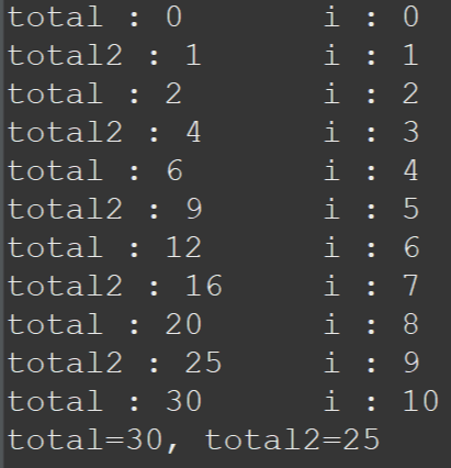 System.out.println("total2 : "+ total2+ "\t" +"i : "+i);