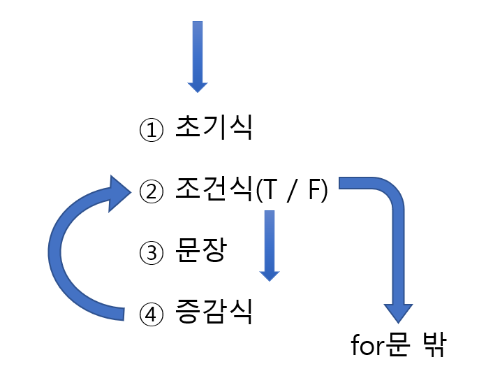 초기식이 실행된 후, 변수값이 조건에 맞는지 검사합니다. true인 경우 문장을 수행한 후 증감식에 따라 변수를 증가시키거나 감소시킵니다. 변경된 값이 조건에 맞는지 다시 검사합니다. 이 과정을 반복 처리하다가 조건식이 false가 되면 반복문을 빠져나옵니다.