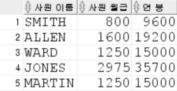SELECT ename "사원 이름", sal "사원 월급", sal*12 "연 봉" FROM emp;