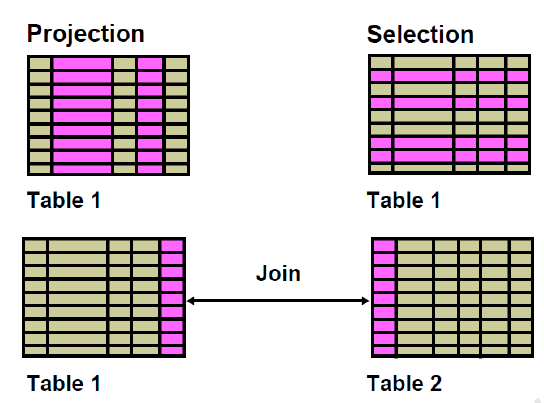 SELECT문은 반환되는 데이터 종류에 따라 Selection, Projection, Join 의 세 가지 처리 기능이 있는데, 그림으로 보자면 다음과 같습니다.