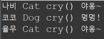 Pet 클래스를 추상 클래스로 만들어 Cat과 Dog이 가지고 있는 공통 속성을 인스턴스 변수로 선언하는 동시에 cry() 함수를 추상 함수로 정의해 하위 클래스들에서 반드시 재정의하도록 강제하고 있습니다. Cat 객체와 Dog 객체를 Pet 타입의 배열로 저장하고 모든 객체의 정보를 for문으로 꺼내오고 있습니다. cry() 함수는 각 클래스에 재정의되어 있기 때문에, 다형성으로 객체를 부모 타입에 저장해도 실제 저장된 객체의 오버라이딩된 함수를 호출하게 됩니다. 따라서 다음과 같은 결과가 출력됩니다.