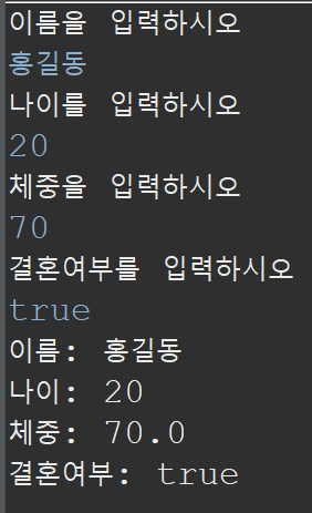 프로그램을 실행하면 다음과 같이 콘솔창에 입력을 할 수 있게 됩니다. 이후 입력한 값을 각 변수에 저장하여 출력하고 있습니다.