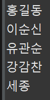 System.out.println(list); //[홍길동, 이순신, 유관순, 강감찬, 세종]