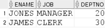 SELECT ename, job, deptno FROM emp WHERE (job,deptno) IN (('MANAGER',20),('CLERK',30));