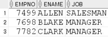 직업이 MANAGER이면서 20번 부서에 속하거나, 직업이 CLERK이면서 30번 부서에 속하는 사원의 정보 출력하려면 다음과 같이 괄호를 이용합니다.