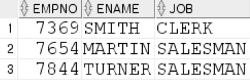 SELECT empno, ename FROM emp WHERE empno=7369 OR empno=7499 OR empno=7521;