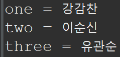 System.out.println(map); //{one=강감찬, two=이순신, three=유관순}