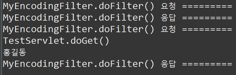 처음 test.html 파일 실행시부터 필터 처리가 수행되는 것을 확인할 수 있습니다. 이후 form의 데이터를 제출하여 서블릿에 요청이 갈 때 다시 필터 처리가 되어 한글이 깨지지 않고 출력되고 있습니다.