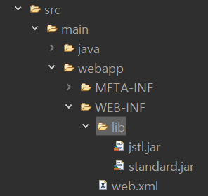JSTL은 외부 라이브러리이기 때문에 드라이버를 따로 다운 받아서 넣어주는 것이 필요합니다. https://tomcat.apache.org/taglibs/standard/ 에서 태그 라이브러리 파일을 다운 받은 후, jstl.jar 파일과 standard.jar 파일 두 가지를 아래와 같이 webapp 폴더 > WEB-INF 폴더 > lib 폴더 안에 붙여넣기 합니다.
